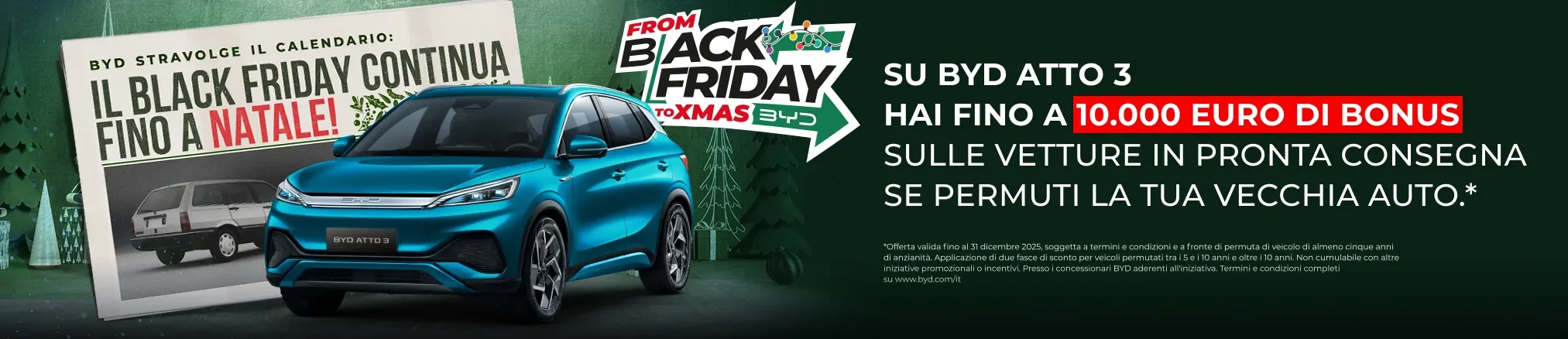 3- Dettagli offerta promozionale valida fino al 31.12.2025. Offerta di noleggio a lungo termine Byd Renting Business relativa a Byd Atto 3 Comfort 36 Mesi/45.000 Km totali. Il canone mensile di € 479 prevede anticipo € 3.500. Tutti i valori sono IVA esclusa. Il canone mensile include tagliandi, vernice metallizzata, manutenzione ordinaria e straordinaria, immatricolazione e messa su strada, RCA con massimale di €25.000.000 (penale € 250), infortunio conducente (PAI J - in caso di morte somma assicurata €40.000, invalidità permanente somma assicurata sino a €40.000 franchigia 3%). Limitazione di responsabilità per: - Danni accidentali (penale 500 €) - Eventi socio politici (penale 500 €) - Incendio e furto (penale 500 €) - Cristalli (penale 250 €) - Atti vandalici (penale 500 €) - Eventi naturali (penale 500 €), Traino e Assistenza 7/24. Offerta salvo approvazione da parte di ARVAL SERVICE LEASE ITALIA S.P.A. nonché alle variazioni di listino. Arval si riserva la facoltà di installare, a propria cura, un sistema di antifurto satellitare (GPS oppure altro sistema). Per tutti i dettagli rivolgersi ai Concessionari ufficiali Byd. La foto è inserita a titolo di riferimento. Le immagini dell’autovettura sono poste a mero titolo esemplificativo e potrebbero pertanto non essere perfettamente rappresentative delle caratteristiche specifiche del prodotto illustrato, che potrebbe essere differente ad esempio per colori e / o accessori, allestimenti, etc.